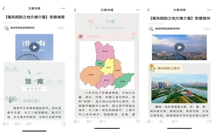 講好文旅故事,盤活易班功能。認真落實《關于深化文旅融合彰顯徽風皖韻加快建設高品質旅游強省的意見》精神,把握文旅類學生成長成才規律,聚焦“思想引領、教育教學、生活服務、文化娛樂”功能,設置“徽風皖韻之地方推介”“環巢湖地區歷史文化名人”“環巢湖旅游攻略”“邊讀邊走環巢湖”“青春文旅·榜樣引領”等5個特色欄目,利用視頻、圖片、文字等形式,將各種地域文化資源、旅游攻略、學習生活服務等整合成一篇篇精美推文,用喜聞樂見的方式推介文旅資源,將網絡思政育人元素融入到學生學習生活中。