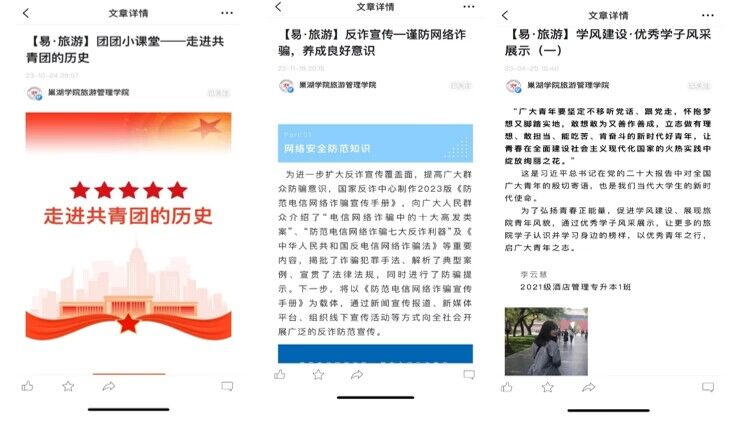 注重整合資源,融入文旅元素。發揮廳級科研機構“環巢湖文化與經濟社會發展研究中心”作用,整合課堂思政、教學實踐、學科競賽、實習實踐等元素,充分挖掘環巢湖豐富的旅游歷史文化資源,實現學院網絡思政工作取材多樣化。結合專業實際,開展思政微課堂演講比賽、行走的紅色課堂等品牌活動,豐富易班活動載體。加強學院網絡媒體融合,做好易班平臺與學院網站、團學公眾號工作聯動,打通線上平臺的界限,積極弘揚主旋律,宣傳推送易班特色活動。