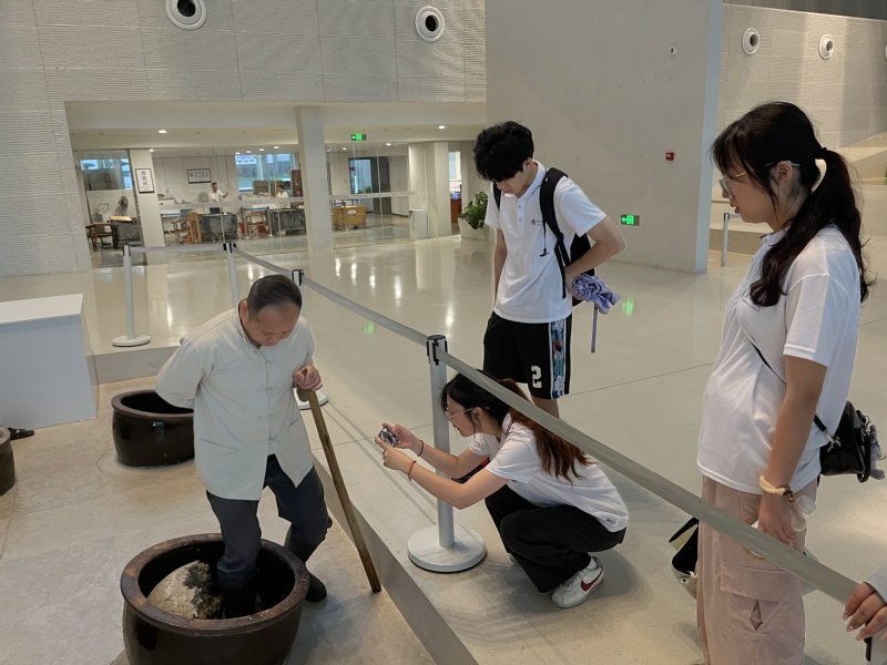 “宣紙制造不僅僅是一項(xiàng)技藝傳承,更加體現(xiàn)了嚴(yán)謹(jǐn)、一絲不茍、精益求精的工匠精神,每一步都凝聚著匠人的智慧與汗水。”在中國(guó)宣紙文化園內(nèi),講解員吳仕雨正為實(shí)踐隊(duì)員介紹宣紙制作流程。坐落在皖南涇縣烏溪境內(nèi)的中國(guó)宣紙文化園,主要由宣紙古作坊、文房四寶體驗(yàn)園、宣紙及世界紙陳列館、書(shū)畫(huà)廊(含書(shū)畫(huà)家工作室)、文房四寶與書(shū)畫(huà)市場(chǎng)、古籍印刷與江南民俗園等七部分組成,隊(duì)員們依次參觀了文化園各個(gè)板塊。在老師傅指導(dǎo)下,實(shí)踐團(tuán)成員親身體驗(yàn)了宣紙制作過(guò)程中的水撈、貼洪、抄撈等環(huán)節(jié),了解了宣紙制作選材、曬紙、質(zhì)檢等各個(gè)流程。大家深刻體會(huì)到宣紙制作不僅需要足夠耐心,同時(shí)還需要操作者眼、手、心巧妙地結(jié)合在一起,只有這樣“撈紙”流程才能如行云流水,一氣呵成。