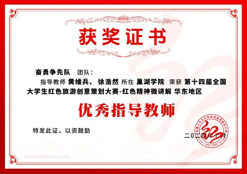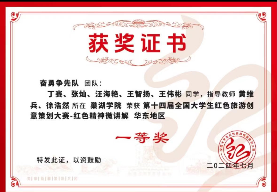 近期,第十四屆全國大學生紅色旅游創意策劃大賽初賽落下帷幕,經過激烈的角逐,由巢湖學院旅游管理學院“奮勇爭先”隊完成的作品斬獲本次大賽(紅色精神微講解類)華東地區一等獎。