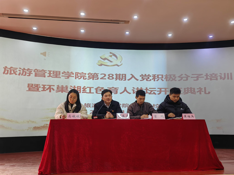 近日,旅游管理學院黨委第28期黨校暨環巢湖紅色文化育人講壇隆重開班。旅游學院黨委副書記、紀委書記鄧其志,學生支部書記曾鵬、黃維兵,新生輔導員高媛媛出席典禮,60名入黨積極分子參加開班儀式。開班典禮由黨校班主任曾鵬主持。