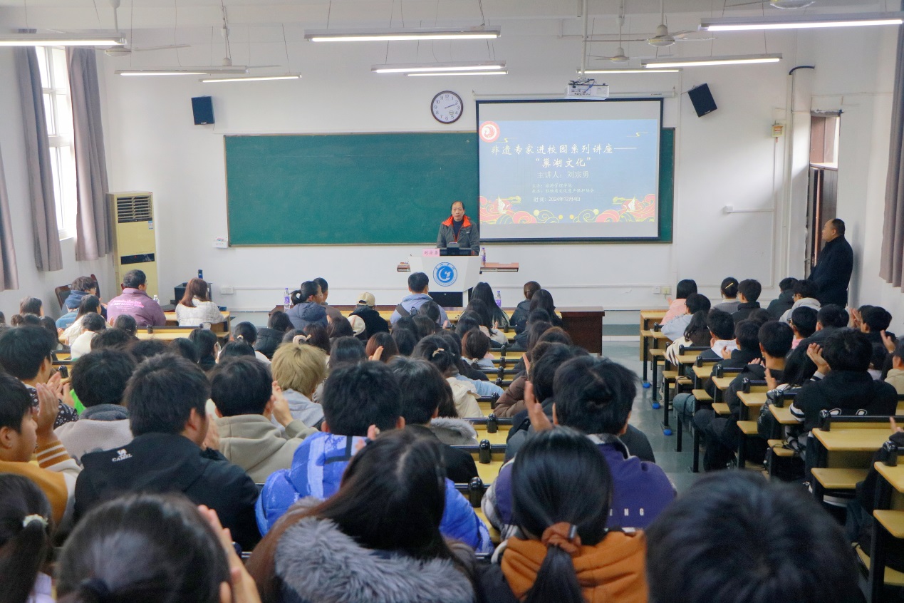劉宗勇為學生們揭開了巢湖文化神秘面紗,帶領同學們穿越時空長廊,走進巢湖文化深處,從歷史脈絡中探尋文化根源,從生動案例中感受文化魅力。從古老民間傳說到非物質文化遺產,從悠久歷史遺跡到生動民俗風情。將自己對巢湖文化深厚情感與獨到見解分享給200多名學生。并與學生們就“當代大學生如何傳承非遺?”等話題進行了精彩互動。
