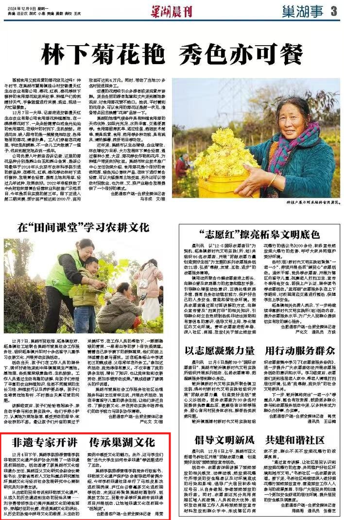 12月4日下午,巢湖學院旅游管理學院非物質文化遺產保護協會開展了一場主題為“巢湖文化”非遺進校園活動。活動邀請了原巢湖市文化館非遺辦主任、巢湖亞父文化研究會副會長兼秘書長、安徽省戲劇家協會、安徽省民俗學會會員、安徽省高校人文社科重點研究基地環巢湖文化與經濟社會發展研究中心兼職研究員劉宗勇主講,本次活動被《巢湖晨刊》報道。