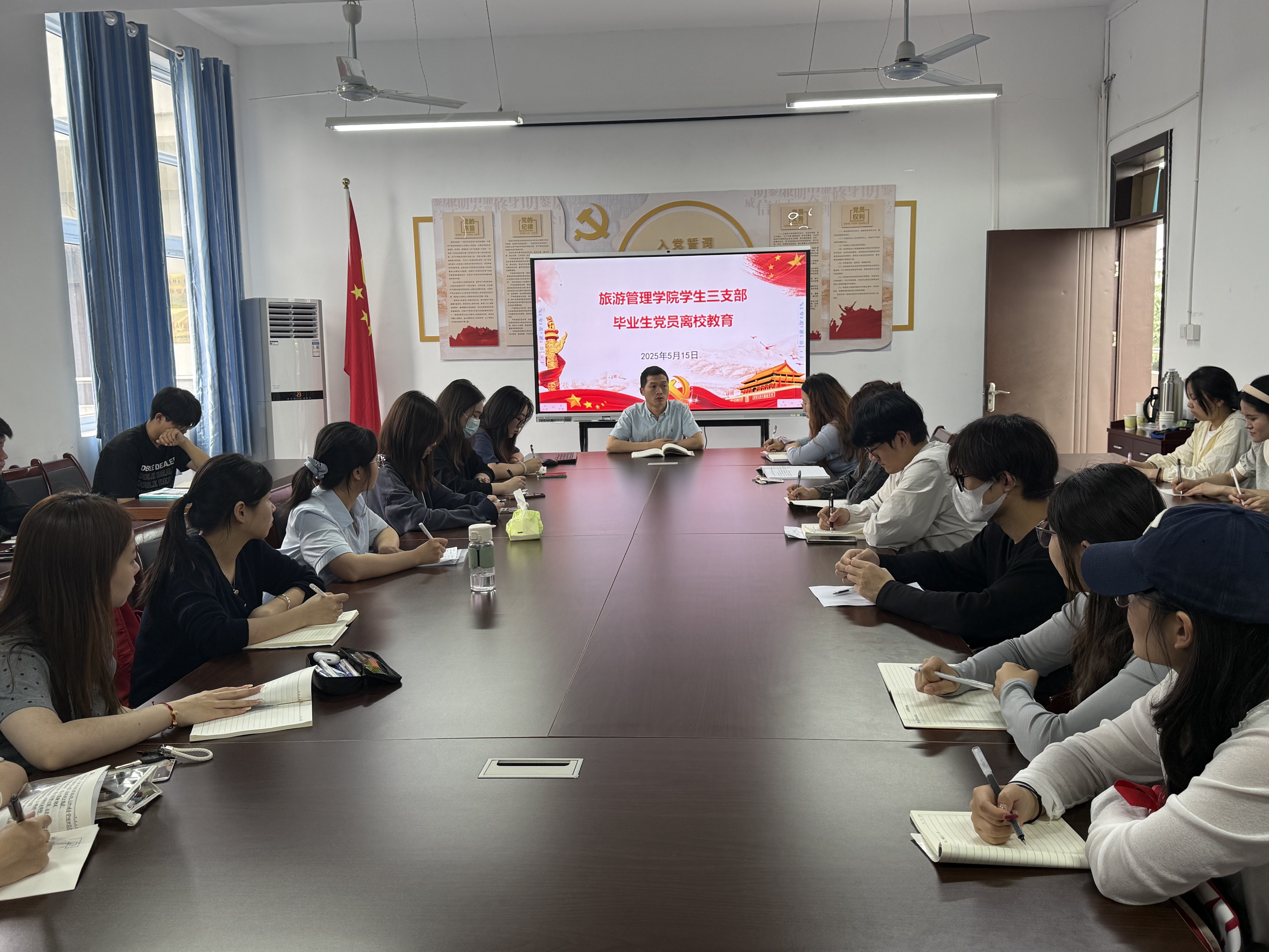 為切實做好畢業生黨員思想教育工作,進一步強化畢業生黨員意識和黨員身份教育,5月15日晚上,旅游管理學院黨委學生第三黨支部在明德樓會議室開展2025屆畢業生黨員離校教育,會議由支部書記曾鵬主持。