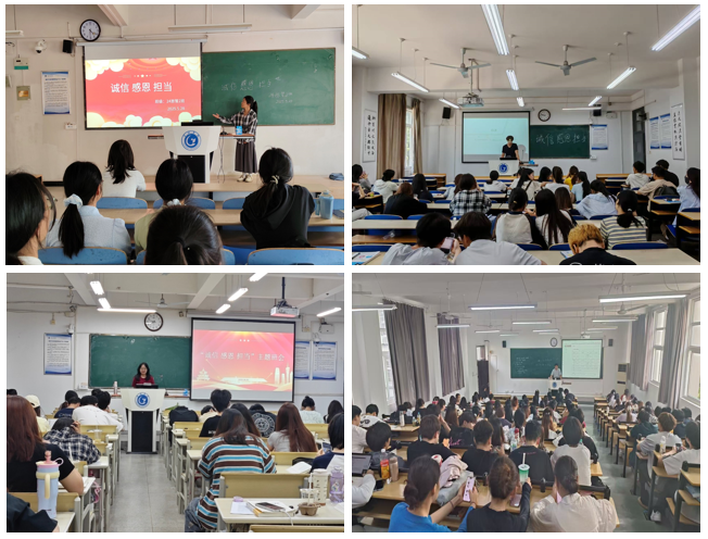 活動(dòng)期間,學(xué)院各年級(jí)專兼職輔導(dǎo)員深入班級(jí)召開“誠(chéng)信?感恩?擔(dān)當(dāng)”主題班會(huì),集中向同學(xué)們講解國(guó)家、學(xué)校資助政策和金融征信知識(shí),提醒同學(xué)們注意防范金融網(wǎng)信詐騙,進(jìn)一步提高學(xué)生對(duì)誠(chéng)信、感恩重要性的認(rèn)識(shí),讓學(xué)生們圍繞誠(chéng)信、感恩、擔(dān)當(dāng)展開熱烈討論,明確作為當(dāng)代大學(xué)生需要樹立受助誠(chéng)信、考試誠(chéng)信、學(xué)術(shù)誠(chéng)信的觀念,營(yíng)造“誠(chéng)信·感恩·擔(dān)當(dāng)”的良好氛圍。