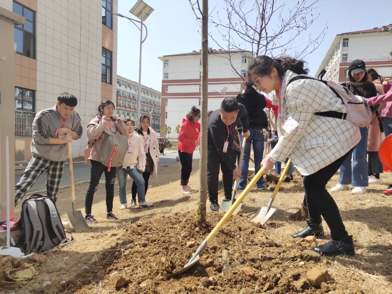活動伊始,志愿者們到達指定的種植位置,大家分工明確,男女生配合默契十足。男生負責拎水、挖坑、澆水,女生負責扶好樹苗、傳遞工具,場面秩序井然。通過合作,參加工商管理學院第一屆青年志愿者協會和18級各專業班級都種下了專屬的紀念樹,一棵棵承載著綠色希望的樹苗被植入肥沃的土壤之中。最后,參與本次植樹活動的同學們在栽種的樹旁拍照留念。
