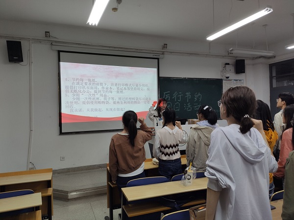 19應統2班通過知識競答的方式,讓同學們了解了更多節約相關的知識。最后,她帶領大家一起宣讀踐行節約承諾書。