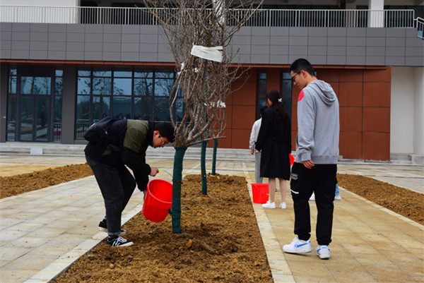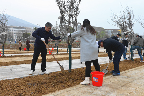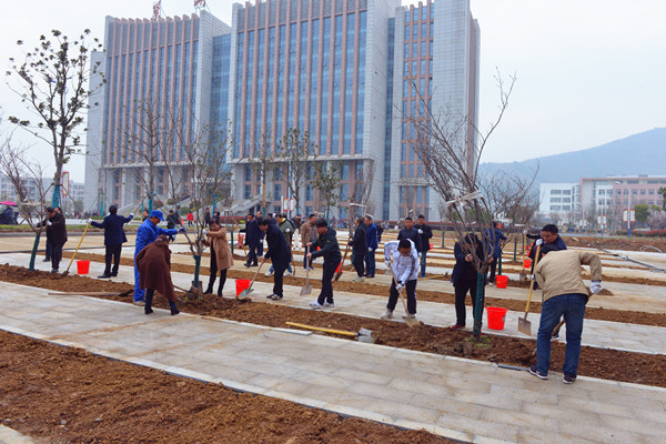 恰逢全民開展義務植樹40周年,3月15日上午,校領導祝家貴、阮愛民、徐柳凡、黃志圣、朱定秀、路順率中層領導干部及師生代表百余人在經濟學院教學實驗樓西北側景觀區域進行義務植樹活動。