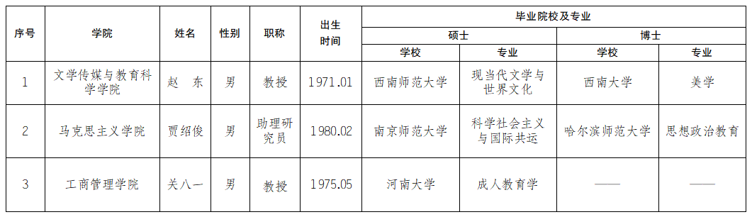 根據(jù)《巢湖學(xué)院引進(jìn)高層次人才及團(tuán)隊(duì)實(shí)施辦法(修訂)》(校字〔2019〕146號(hào))文件要求,經(jīng)考核,擬錄用趙東等3人,現(xiàn)予以公示。公示時(shí)間為2021年6月24日至2021年6月30日。公示期間如有異議請(qǐng)與人事處、紀(jì)委辦反映(電話(huà):0551-82362063 82360369)。