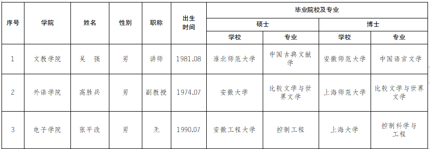 根據《巢湖學院引進高層次人才及團隊實施辦法(修訂)》校字〔2019146文件要求,經考核,擬錄用吳強等3人,現予以公示。公示時間為202192日至202198日。公示期間如有異議請人事處、紀委辦反映(電話:0551-82362063 82360369)。