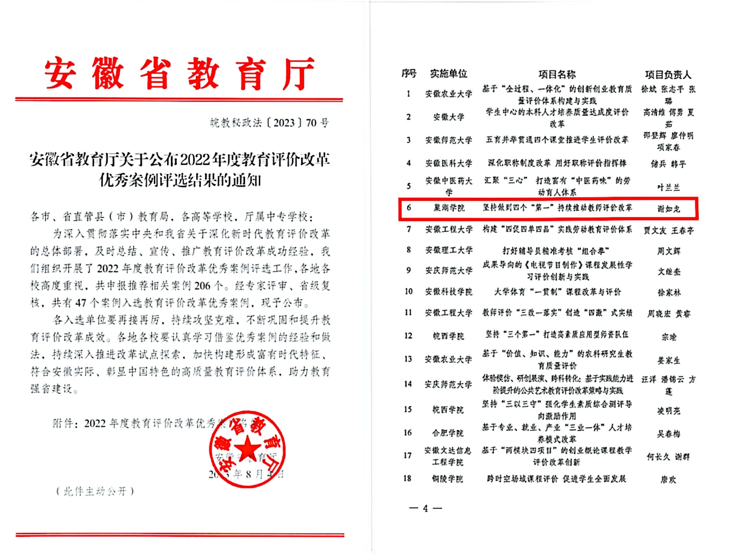 近日,安徽省教育廳公布2022年度教育評價改革優秀案例名單,本科高校共有18個優秀案例入選,我校黨委教師工作部申報的案例《堅持做到四個“第一”持續推動教師評價改革》成功入選。