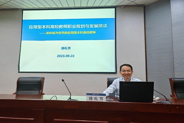 開班儀式結束后,文學與傳媒學院徐禮節教授以“應用型本科高校教師職業規劃與發展瑣談——怎樣成為優秀的應用型本科高校教師”為題,從“意識到位”“認識明確”“定位清晰”“視野開闊”“遵守規范”“端正態度”“付諸行動”七個方面圍繞教師職業規劃與發展路徑,為新教師生動講授了第一課。
