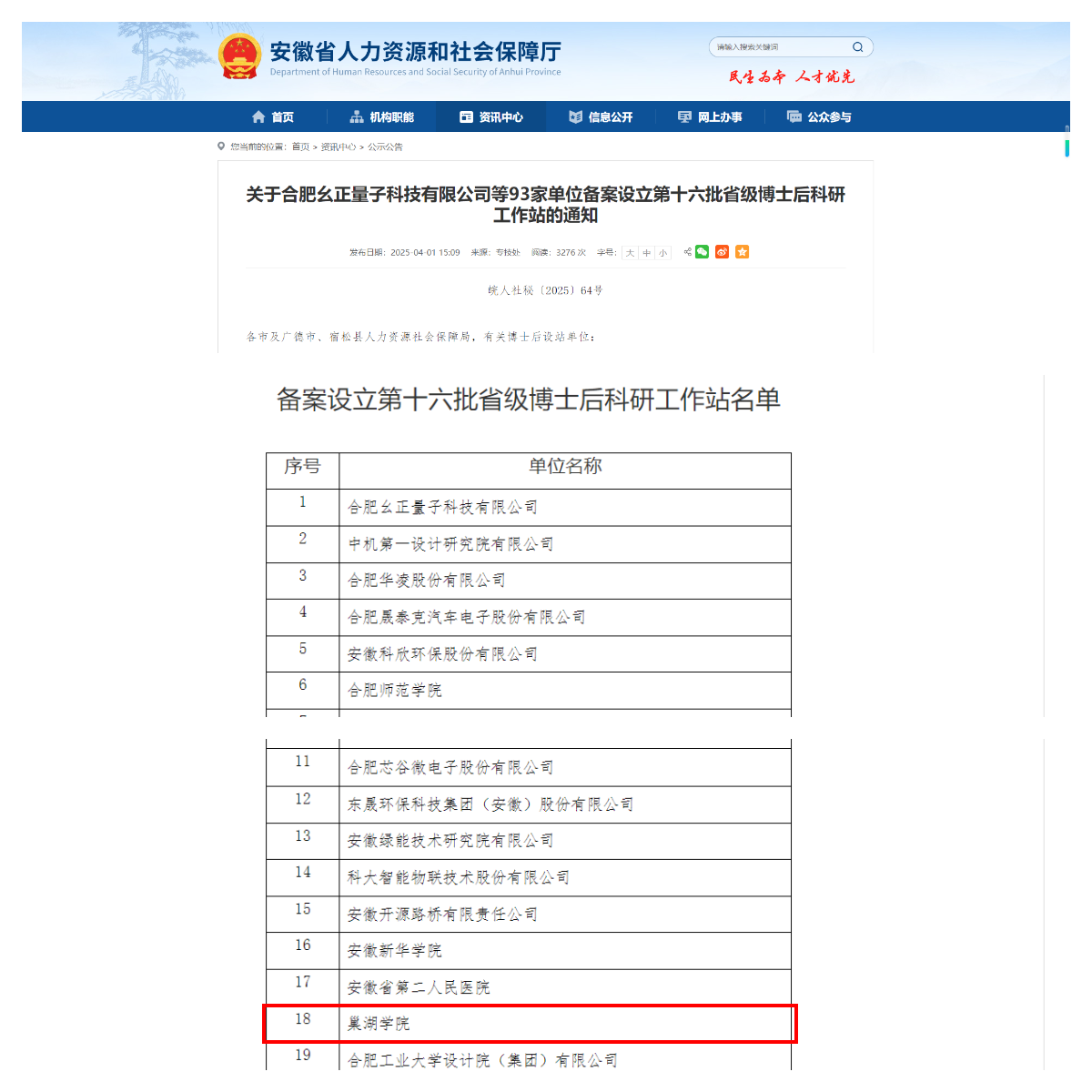 4月1日,安徽省人力資源和社會保障廳公布了第十六批省級博士后科研工作站設立名單,巢湖學院名列其中。這是學校在高層次科研平臺建設方面取得的新成績,標志著學校在高層次人才培養、產學研協同創新等方面實現了新突破。