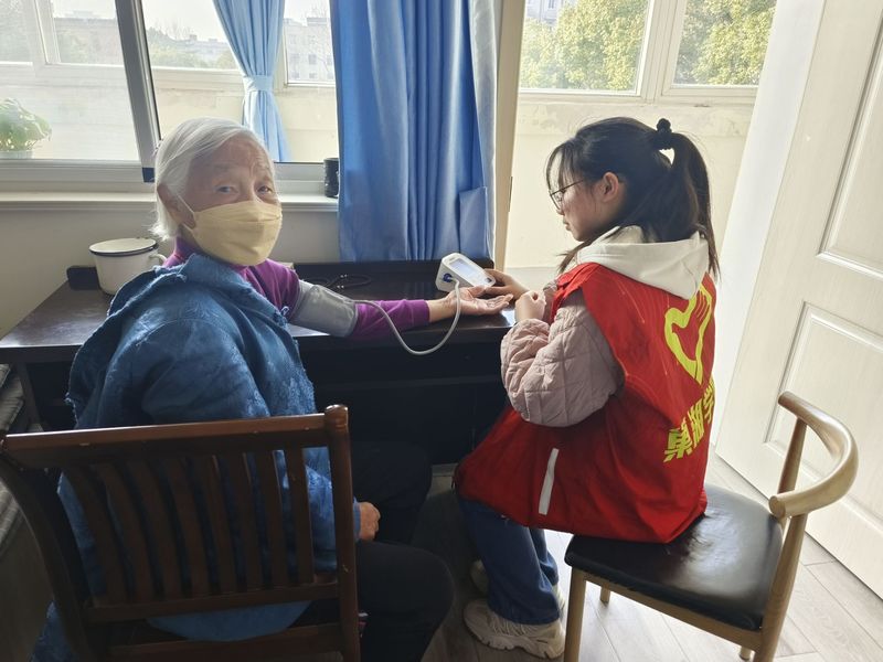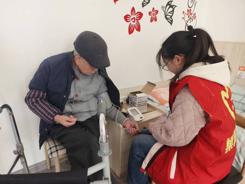 志愿者們?cè)趯I(yè)老師的指導(dǎo)下,幫助老人們測(cè)量血壓,并結(jié)合自己所學(xué)的專業(yè)知識(shí)向他們講解養(yǎng)生和健康常識(shí),提醒長者們注意日常生活飲食。同學(xué)們或與老人握手聊天,或?yàn)槔先舜芳纭⒛笸龋驍v扶老人散步,或整理床鋪、打掃衛(wèi)生,用實(shí)際行動(dòng)為老人們帶去親切的問候和真摯的關(guān)懷。隨后,志愿者們?yōu)槔先藗儽硌萘司实母栉韫?jié)目,贏得了他們會(huì)心的微笑和熱烈的掌聲,給初春的敬老院增添了一份溫馨。