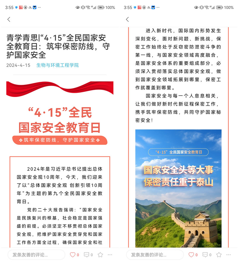 學院始終把國家安全教育納入學生的日常學習生活中,積極拓展師生線上線下學習了解國家安全知識的渠道,以國家安全和保密宣傳、反邪教警示教育為主題,發布相關推文。同時,通過舉辦升旗儀式等活動,面向師生開展國家安全知識宣傳,營造良好的校園國家安全氛圍。