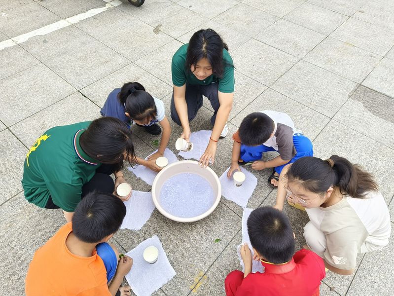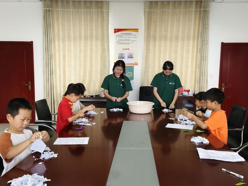 下午,志愿者們帶領小朋友們開展了一場別有生趣的“變廢為寶,廢紙再生”手工實踐活動。在志愿者們的指導下,孩子們先把廢報紙撕成碎紙,將碎紙浸泡在水里,再用工具將廢紙攪拌成紙漿,經過攪拌、分離、平鋪、自然晾干等一系列步驟之后,一幅幅再生紙在孩子們手中誕生。孩子們紛紛表示,“廢紙真的再生了”“太神奇了”,伴隨著一聲聲的驚嘆,環保的理念在孩子的心中生根發芽……