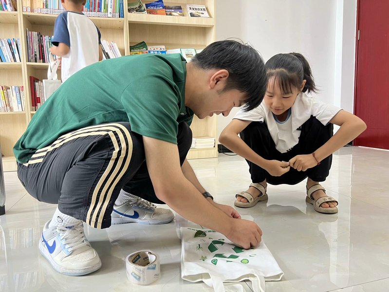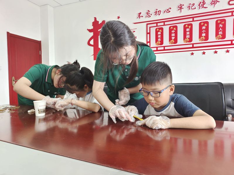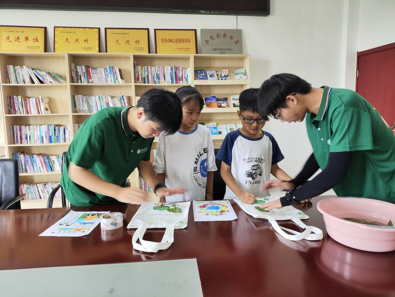 7月20日,宣講團前往松店村村委會活動中心開展植物拓印趣味活動。志愿者們向小朋友們講解有關植物拓印的知識,帶領他們將浸泡明礬水的植物擦干,按自己的想法鋪排在帆布袋上,用透明膠固定,用小錘子將植物的汁水敲打出來,制作自己獨一無二的“印記”,小朋友們在活動中發揮了創造力和想象力,增強他們作為地球小公民的責任感。