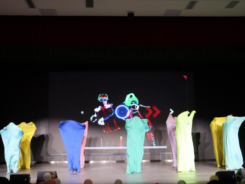 舞蹈《彩影舞韻》中一群彩色的小人如同靈動的精靈,在舞臺之上翩翩起舞,他們的每一個舞步,都似跳動的音符,奏響活力的樂章。