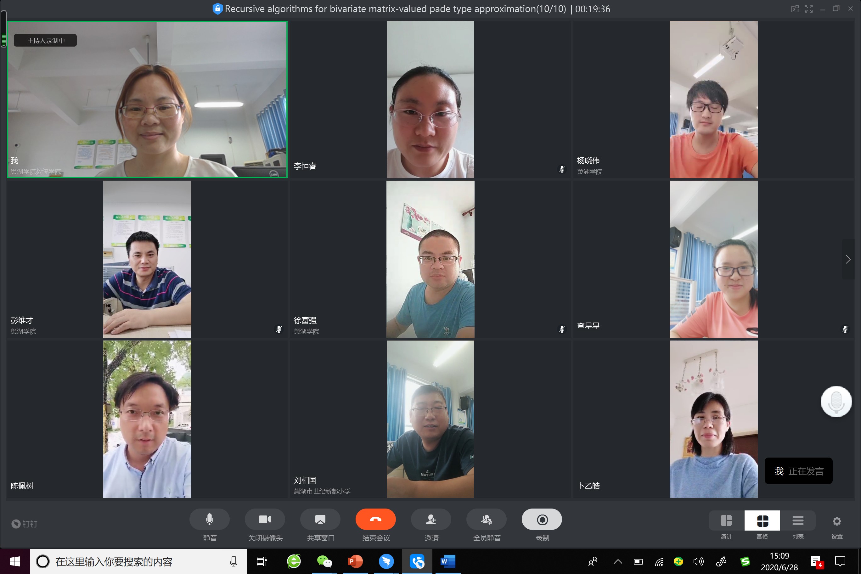 628日下午,數學與統計學院王冬銀作題為“Recursive algorithms for bivariate matrix-valued Padé type approximation”的在線學術講座。數學與應用數學教研室教師及其他感興趣的教師參加了講座。