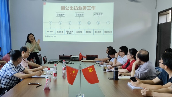 會議伊始,史國東簡要介紹了近幾年學(xué)校國際交流工作的各項(xiàng)成果。隨后,榮幸從遞交材料、批件申請、批件確認(rèn)件發(fā)放、申辦證照、證照發(fā)放、申辦簽證以及領(lǐng)證照共計七個方面進(jìn)行因公出訪業(yè)務(wù)工作流程講解。并就其中重要節(jié)點(diǎn)注意事項(xiàng),如:因公出訪與因私出訪異同點(diǎn)、遞交材料時間節(jié)點(diǎn)以及訪問期間情況處理等問題進(jìn)行重點(diǎn)講解。