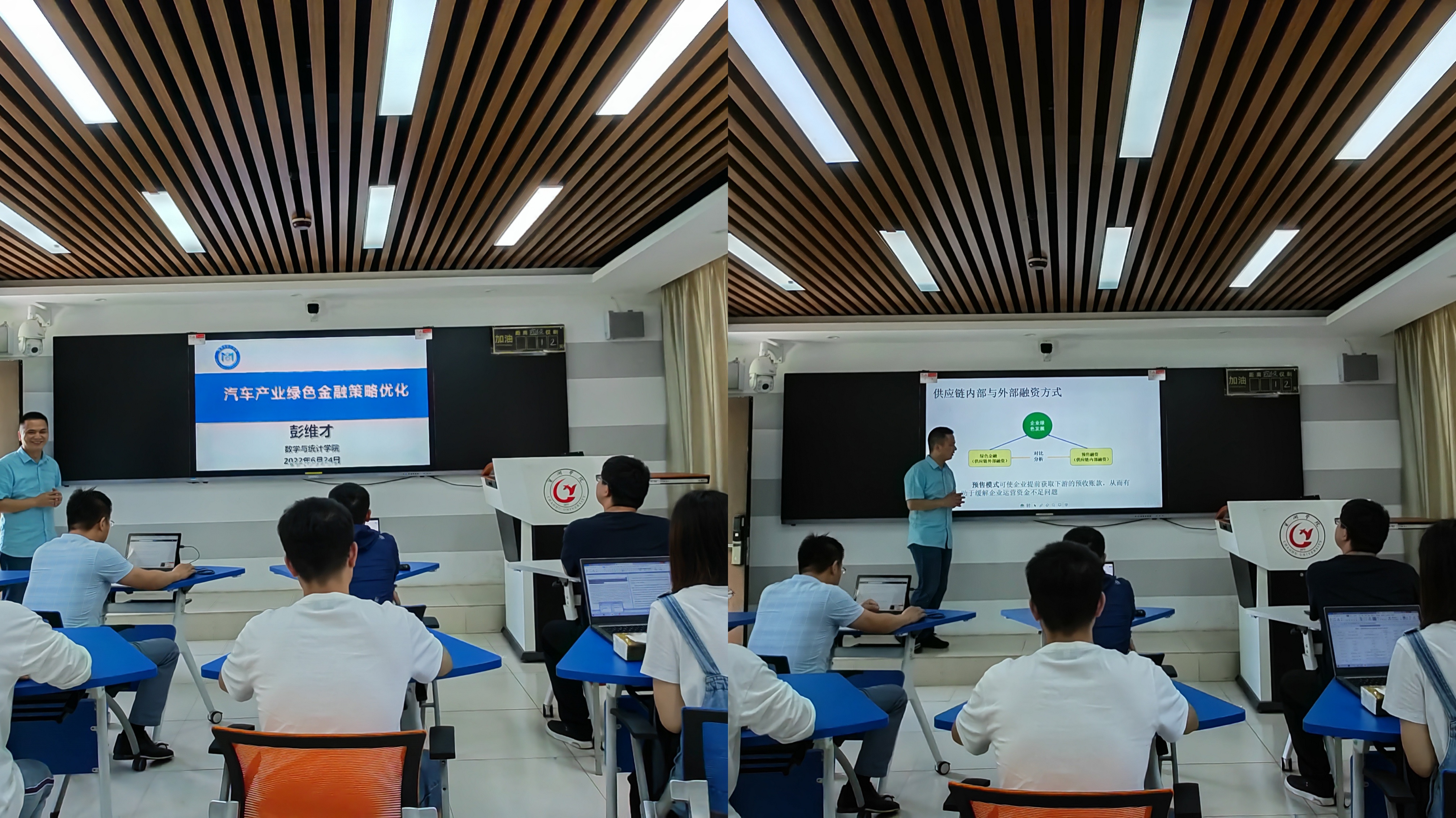 6月24日下午14:30,數學與統計學院副教授彭維才博士在明德樓105作題為“汽車產業綠色金融策略優化”的學術報告。“雙碳”文獻討論班全體成員、部分感興趣的教師參加了報告會。