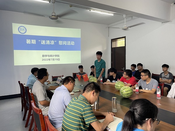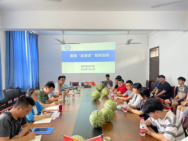7月19日下午,數統學院在學院會議室開展暑期“送清涼”慰問活動,學院副院長謝如龍、副書記袁鳳琴、教研室主任陳佩樹、彭維才及輔導員管成功及留校學生代表參加活動。