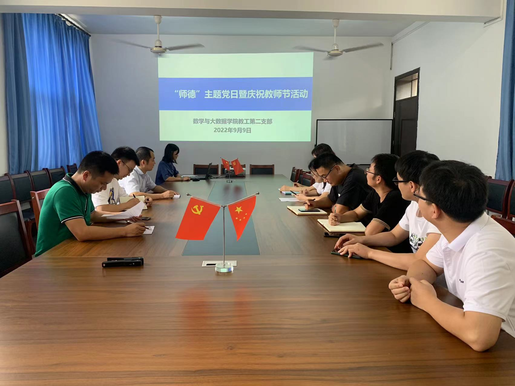 在第38個教師節來臨之際,數學與大數據學院教工第二黨支部于9月9日下午在明德樓會議室開展了“弘揚高尚師德,潛心立德樹人”主題黨日暨慶祝教師節活動。支部黨員教師匯聚一堂共同慶祝自己的節日。