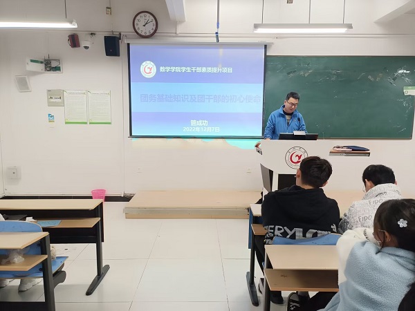 為進一步學習貫徹黨的二十大精神,認真貫徹落實習近平總書記關于青年工作的重要思想,數學與大數據學院面向學院各團支部、學生組織開展了為期7天的第二期“青馬工程”學生骨干培訓,數學與大數據學院副院長陳佩樹、團委副書記冀祥麟、輔導員管成功、馬克思主義學院賈紹俊博士分別主講。