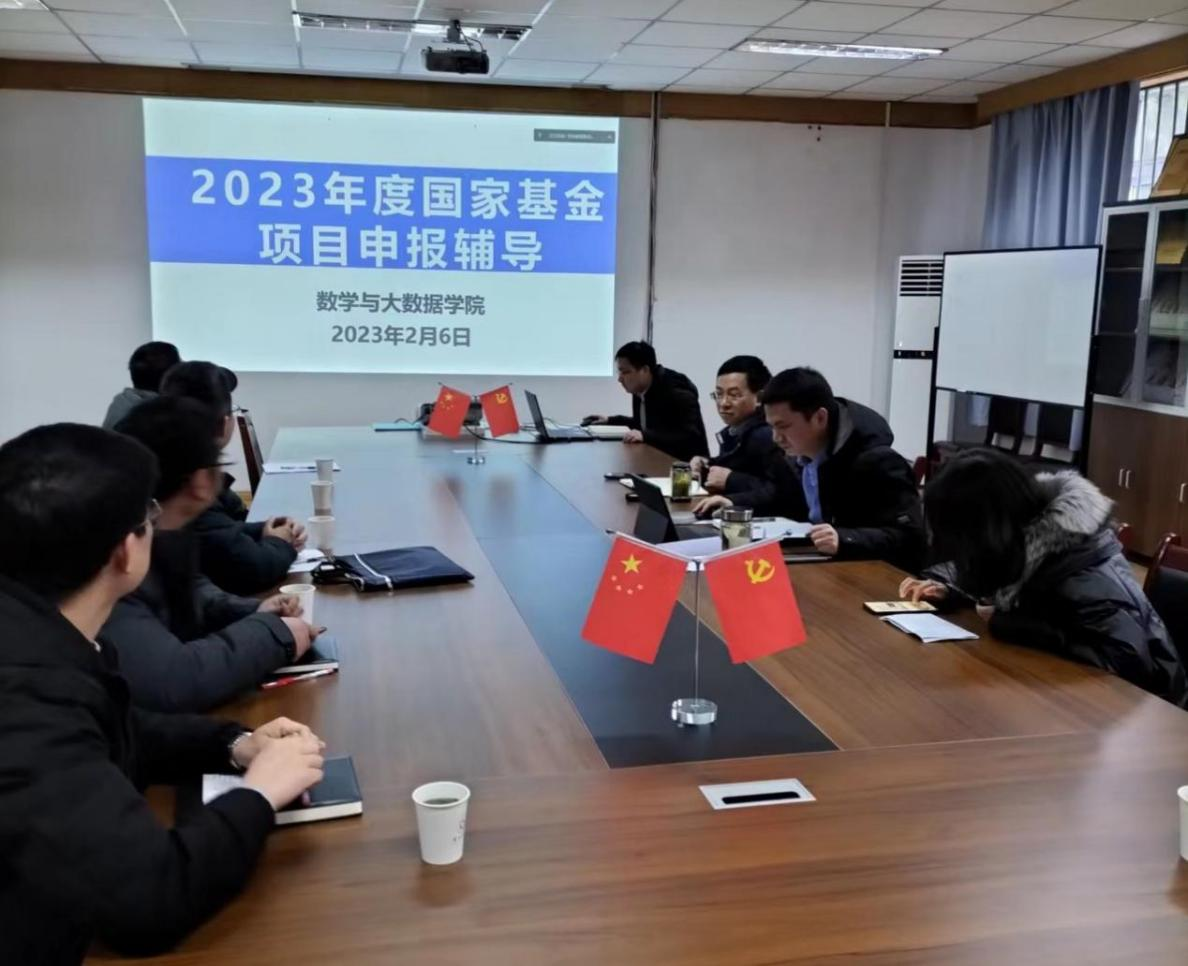 為做好2023年度國家自然科學基金、國家社會科學基金項目申報工作,提高項目申報質量,2月6日上午,數學與大數據學院組織開展了2023年國家基金項目申報專家論證會。本次會議邀請了浙江財經大學魯仕寶教授擔任論證專家,為數學與大數據學院國家基金項目申報進行指導。校黨委教師工作部部長謝如龍、科研處副處長陳海銀、數學與大數據學院副院長陳佩樹、副書記郝江鋒、副院長彭維才、趙開斌教授及數學與大數據學院全體國家基金項目申報教師參加了論證會,論證會采用線上和線下相結合的方式進行。本次會議由副院長陳佩樹主持。