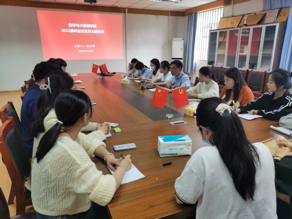 為深入開展學(xué)習(xí)貫徹習(xí)近平新時代中國特色社會主義思想主題教育,加強(qiáng)畢業(yè)生黨員教育,5月29日下午,數(shù)學(xué)與大數(shù)據(jù)學(xué)院在篤行樓二樓學(xué)院會議室開展畢業(yè)生黨員專題黨課。此次黨課由學(xué)院黨委副書記郝江鋒主講,畢業(yè)班輔導(dǎo)員和全體畢業(yè)生黨員參加。