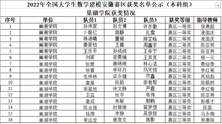 近日,全國及安徽省大學(xué)生數(shù)學(xué)建模競賽組委會公布2023年“高教社杯”全國大學(xué)生數(shù)學(xué)建模競賽獲獎名單,我校數(shù)學(xué)建模團隊獲得安徽省賽區(qū)一等獎2項,二等獎4項,三等獎10項的優(yōu)異成績,并獲得安徽賽區(qū)優(yōu)秀組織獎,另有2位老師獲得省級優(yōu)秀指導(dǎo)教師獎項。