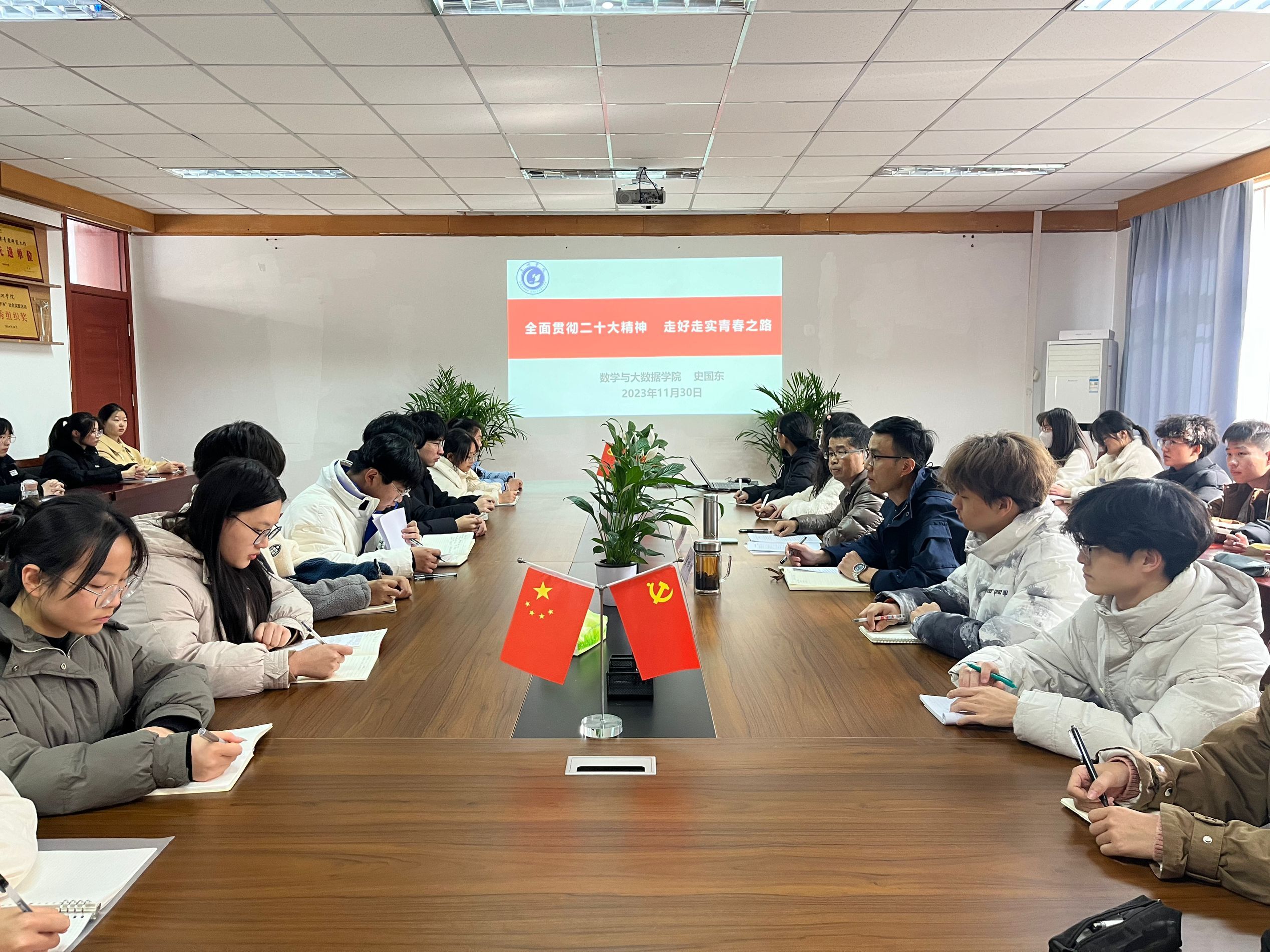 為深入學(xué)習(xí)貫徹黨的二十大精神,進(jìn)一步增強(qiáng)學(xué)生干部理想信念,勉勵(lì)青年學(xué)子勇?lián)鷷r(shí)代重任,11月30日中午,數(shù)學(xué)與大數(shù)據(jù)學(xué)院黨委書記史國東在院會議室給數(shù)學(xué)與大數(shù)據(jù)學(xué)院團(tuán)學(xué)干部上題為《全面貫徹黨的二十大精神 走好走實(shí)青春之路》的黨課,會議由數(shù)學(xué)與大數(shù)據(jù)學(xué)院團(tuán)委副書記冀祥麟主持,全體學(xué)生黨員和團(tuán)學(xué)干部參會。