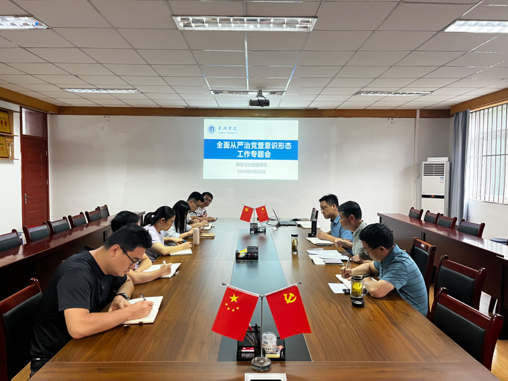 為深入學習貫徹落實黨的二十大精神,推動黨紀學習教育走深走實,落實落細全面從嚴治黨各項要求,不斷提高黨員干部政治覺悟和思想敏銳性,守好意識形態主陣地,6月28日上午,數學與大數據學院在篤行樓會議室召開全面從嚴治黨暨意識形態工作專題會議。會議由學院黨委書記史國東主持,副書記兼副院長陳佩樹、副書記郝江鋒、黨委委員、科級干部、支部書記、支部副書記等參加會議。