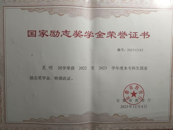 吳明,男,漢族,2002年9月出生, 中共黨員,巢湖學院數學與應用數學專業2020級學生。在校期間擔任班級班長、院學生會辦公室干事、巢湖學院網宣員。曾獲2021-2022和2022-2023學年年度國家勵志獎學金、巢湖學院“優秀學生”“優秀學生干部稱號。積極參加學科競賽和社會實踐活動, 獲得第十二屆全國大學生市場調查與分析大賽省級二等獎、全國大學生數學建模競賽省級三等獎,第九屆巢湖學院“互聯網+”大學生創新創業大賽銀獎、家鄉“抗擊疫情,志愿服務”榮譽證書。在2024年研究生入學考試中,考入安徽工業大學數學專業。