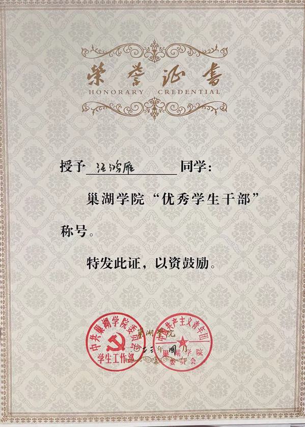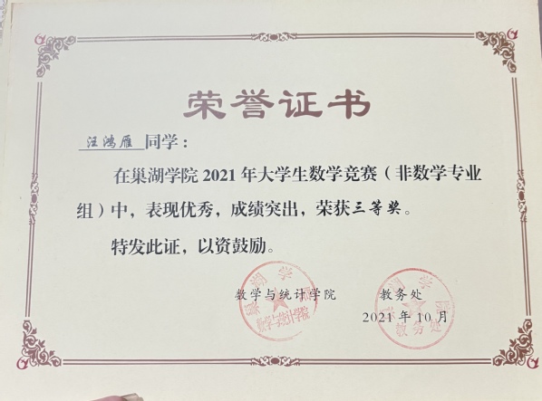 汪鴻雁,女,漢族,2002年1月出生,中共黨員,巢湖學院數學與大數據學院應用統計學專業2020級學生。在校期間曾擔任班級心理委員、院學生會文藝部部長,曾獲三次校一等獎學金、“優秀學生”、“優秀學生干部”等稱號。在2024年研究生入學考試中,考入南京審計大學應用統計學專業。