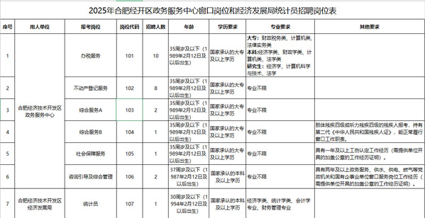 因工作需要,現面向社會公開招聘合肥經開區政務服務中心窗口崗位和經濟發展局統計員崗位,現將有關事項公告如下: