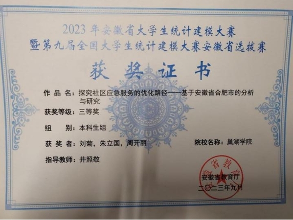 “統計學不僅是一門學科,更是認識世界的工具。”朱立國對專業的熱愛,化作了日復一日地刻苦鉆研。他嚴謹對待每一門核心課程,統計學、數學分析等課程成績穩居班級前列,連續多年榮獲校級獎學金;更注重將理論轉化為實踐,積極投身學科競賽——在第十三屆安徽省大學生市場調查與分析大賽中,他參與的《“應”眾之意,及人所“急”——基于安徽省社區應急服務調查研究》斬獲本科生組三等獎;2023年,團隊作品《探究社區應急服務的優化路徑 —— 基于安徽省合肥市的分析與研究》在省級統計建模大賽中再獲殊榮。這些成果,是他“學用結合”的最佳注腳。