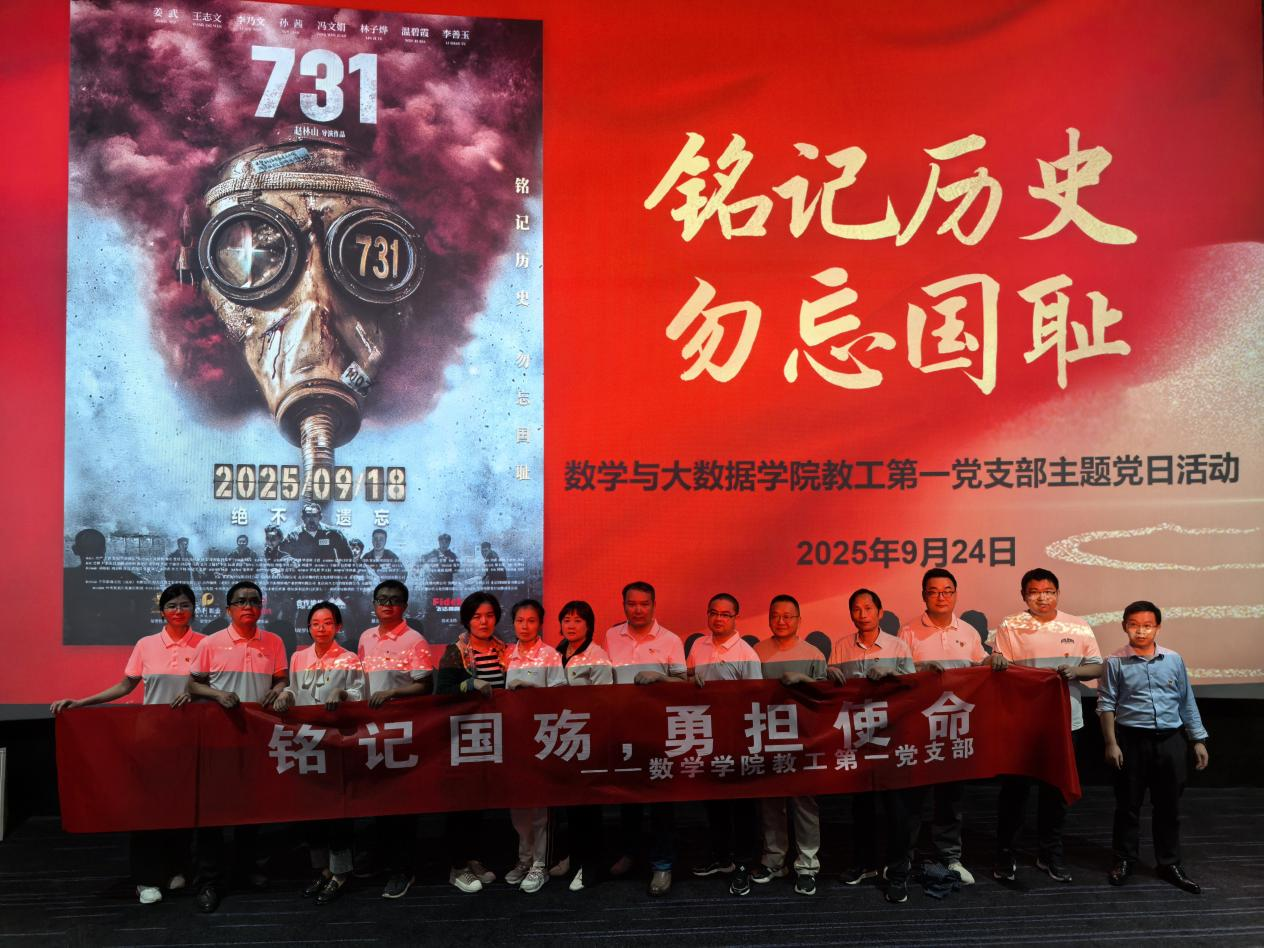 為扎實推進新時代高校黨建示范創建和質量創優工作,加強理想信念教育,提升黨員黨性修養,9月24日下午,數學與大數據學院教工第一黨支部開展“銘記歷史·勿忘國恥”主題黨日活動,集中觀看歷史題材電影《731》。