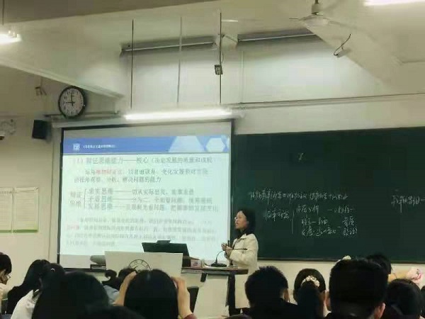 王紅麗老師以“學習唯物辯證法,不斷增強思維能力”為主題進行示范教學。上課伊始,她從總體上強調唯物辯證法是唯物主義、辯證法和認識論的統一,是認識世界和改造世界的根本方法,接著重點講授了“五大思維能力”。其中,辯證思維能力是核心,包含求實思維、矛盾思維、發展思維,決定事物發展的質量和成敗,要求一切從實際出發,實事求是,用聯系與發展的眼光看問題。戰略思維能力是統領,包含全局思維和前瞻思維,決定事物發展的方向和層次,要求用全局眼光把握事物發展的方向與大勢,落葉知秋,見微知著。歷史思維能力是基礎,包含后瞻思維和發展思維,決定事物發展的路徑和信念,要求以史為鑒、知古鑒今。創新思維能力是動力,體現思維的創新性、靈活性、開拓性,決定事物發展的速度和潛力,要求突破思維定勢,綜合運用多種思維方法,研究新情況、解決新問題、創造新經驗、開創新局面。底線思維能力是原則,包含風險思維和積極思維,決定事物發展的標準和尺度,要求居安思危,界定底線,化危為機,把握主動。最后,組織學生展開“新冠肺炎抗疫飽含著什么樣的哲學意蘊?”主題討論,解讀了“五大思維能力”在新時代黨的治國理政中的重要作用及其對馬克思主義中國化時代化的影響。