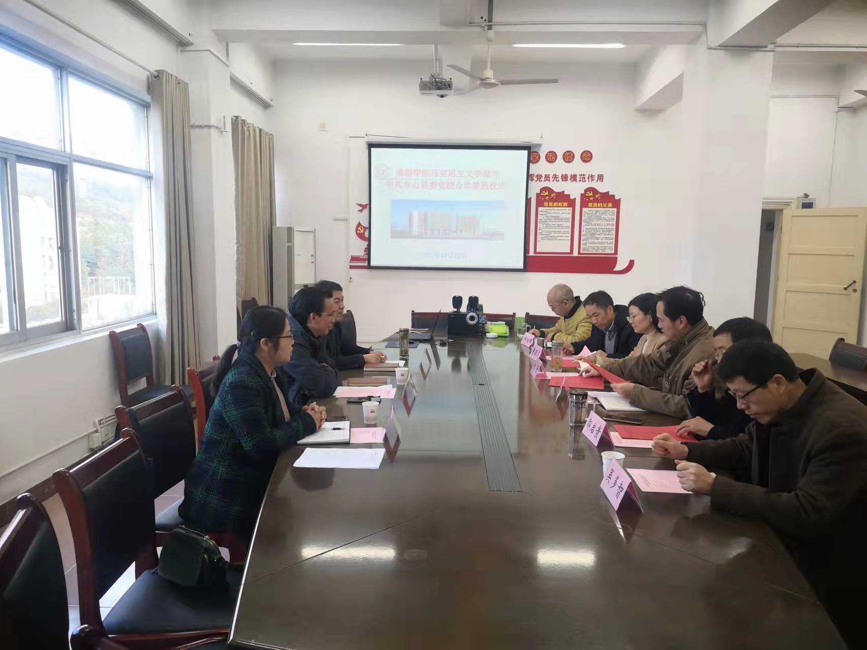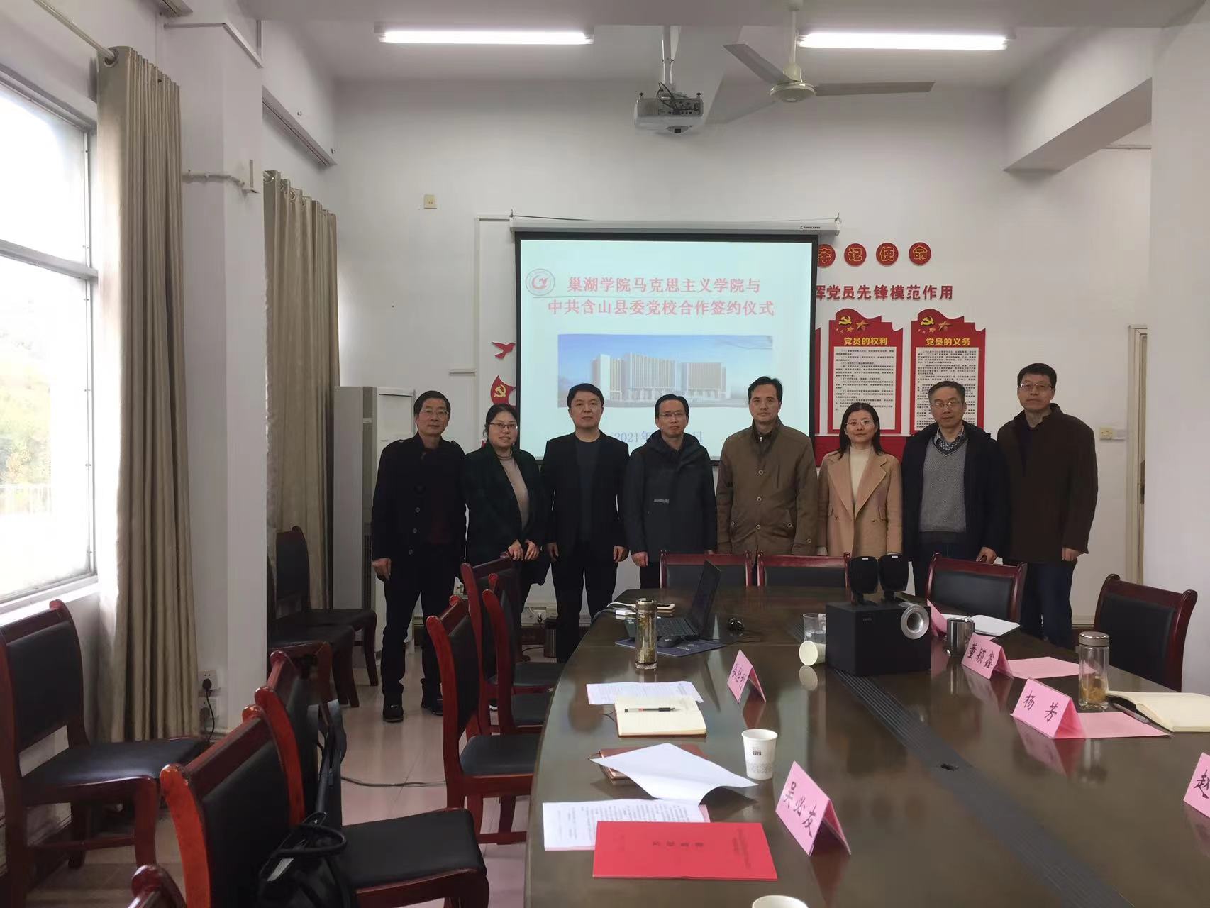 為進一步加強與地方相關單位的合作與交流,切實發揮馬克思主義學院服務環巢湖的作用,11月12日下午,馬克思主義學院與中共含山縣委黨校合作簽約儀式在學院會議室隆重舉行。馬克思主義學院趙光軍副院長、楊芳副院長、含山縣委黨校常務副校長吳必友、黨校副校長谷勝利、黨校校委委員胡燕,以及學院董穎鑫、郭啟貴、吳多智、郝成超等老師共同出席了簽約儀式,會議由趙光軍副院長主持。