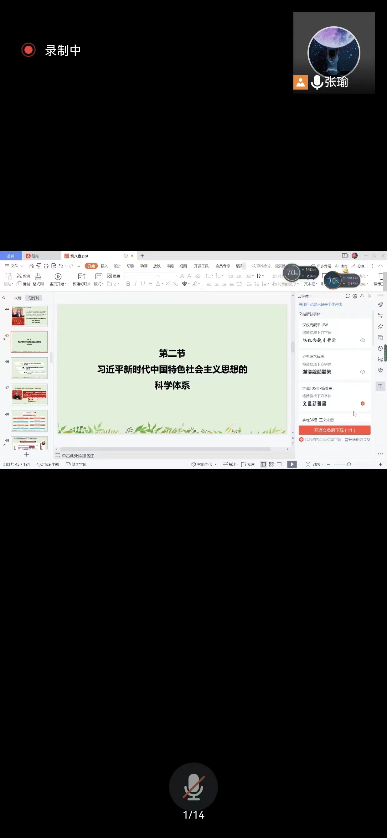 張老師本次課主要講解習近平新時代中國特色社會主義思想的核心觀點和主要內容。她首先將十九屆六中全會與十九大報告關于習近平新時代中國特色社會主義思想的主題表述進行了對比,并圍繞“新時代堅持和發展什么樣的中國特色社會主義、怎樣堅持和發展中國特色社會主義、建設什么樣的社會主義現代化強國、怎樣建設社會主義現代化強國、建設什么樣的長期執政的馬克思主義政黨、怎樣建設長期執政的馬克思主義政黨”三個主題展開分析,詳細介紹了三個主題的形成依據以及三個主題之間的內在關系。講課過程中,張老師熟練運用現代化信息技術手段開展線上課堂互動,隨時追蹤學生上課狀況,穿插習近平系列講話部分音視頻資料,學生參與度較高,課堂教學達到了預期效果。