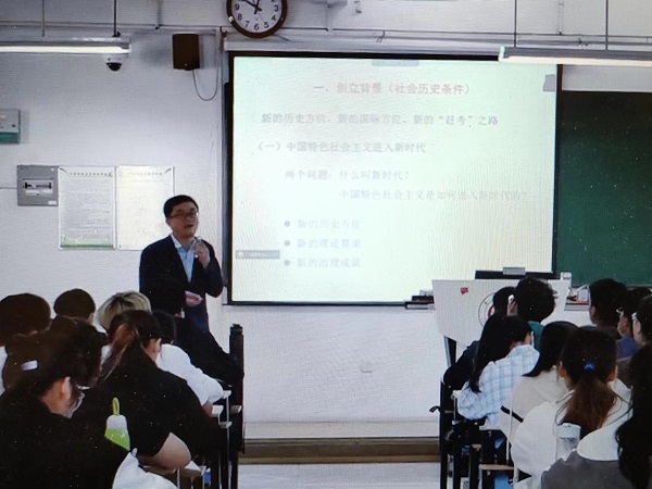 石慶海老師的授課主題是“習(xí)近平新時(shí)代中國(guó)特色社會(huì)主義思想創(chuàng)立背景”。他通過回顧黨的十九大報(bào)告的相關(guān)論述,告訴同學(xué)們中國(guó)特色社會(huì)主義進(jìn)入新時(shí)代,既是我國(guó)發(fā)展新的歷史方位,也是我們新的“趕考之路”,從而自然導(dǎo)入本次授課主題。他從新的歷史方位、新的理論要求、新的治理成就三個(gè)方面回答了什么叫新時(shí)代,中國(guó)特色社會(huì)主義是如何進(jìn)入新時(shí)代的兩個(gè)問題。在對(duì)這兩個(gè)問題的解答中,逐步闡述清楚了中國(guó)特色社會(huì)主義進(jìn)入新時(shí)代的社會(huì)歷史條件,展現(xiàn)了石老師深厚的專業(yè)理論功底。