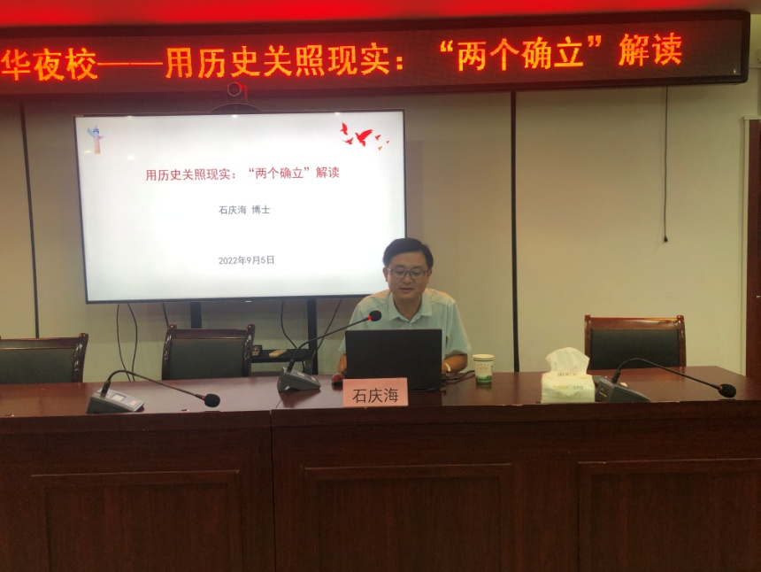 9月5日,應巢湖市城市管理局邀請,石慶海老師為該局“芳華夜校”作了題為《用歷史關照現實:“兩個確立”解讀》的專題講座。講座由陶學勇副局長主持,城管局青年骨干40余人聆聽了此次講座。