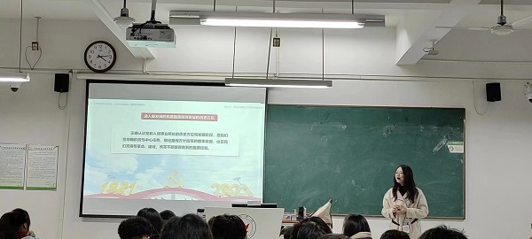 11月14日,姚鈺婷老師于慎思樓中303教室進行了公開教學。本次公開教學內容為“以新發展理念引領高質量發展”。在課堂上,姚鈺婷老師采用《數說新時代》的視頻導入主題,讓學生感受到十八大以來中國經濟社會發展取得的舉世矚目成就,通過視頻啟發學生思考并點明本節課的講課思路。課堂中,姚鈺婷老師圍繞“新發展階段”展開講解,從進入新發展階段的基本依據、新發展階段所面臨的機遇與挑戰、新發展階段與社會主義初級階段的關系三個方面進行闡述。