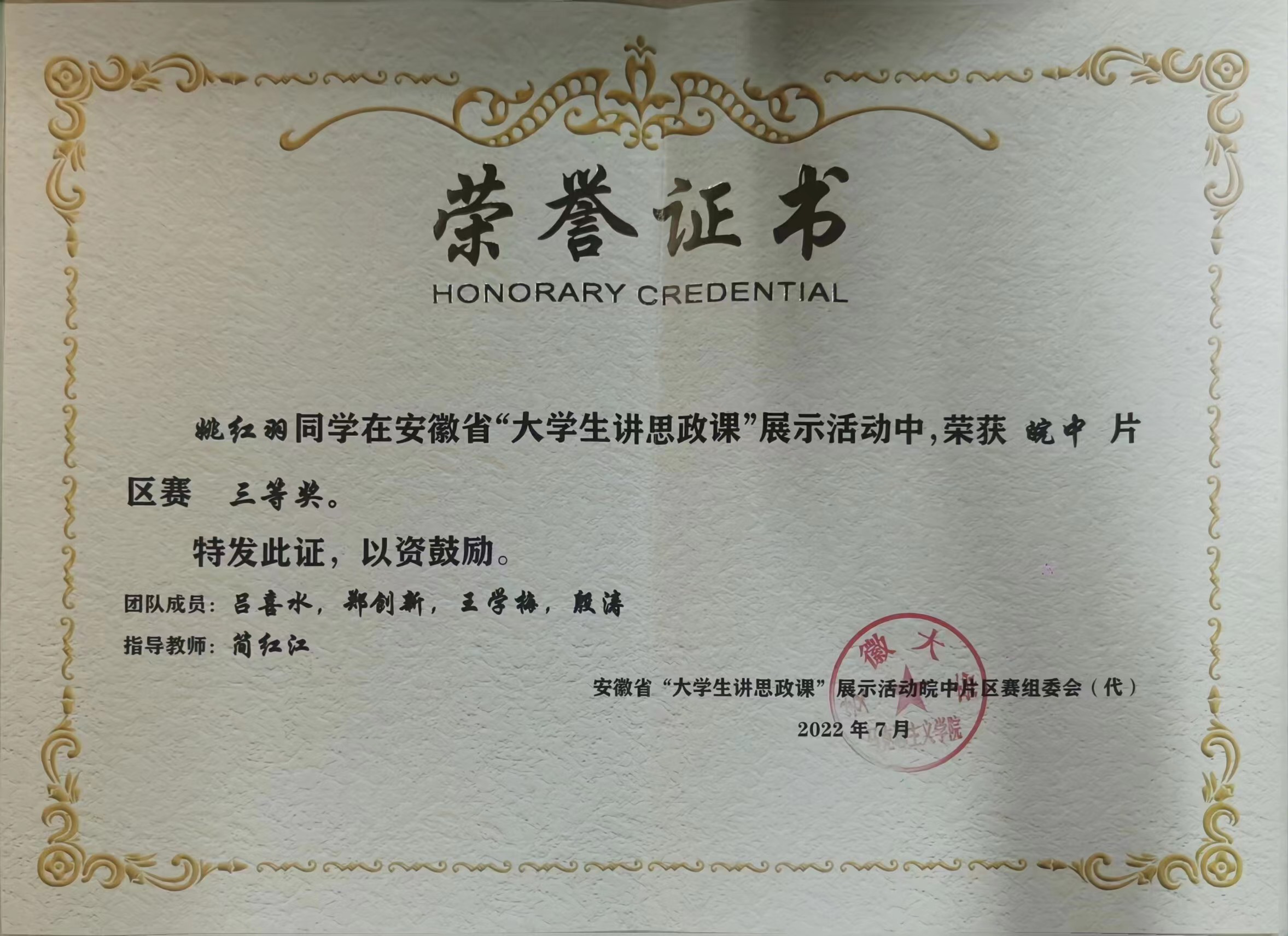 指導“大學生講思政課”展示活動中榮獲皖中片區 三等獎