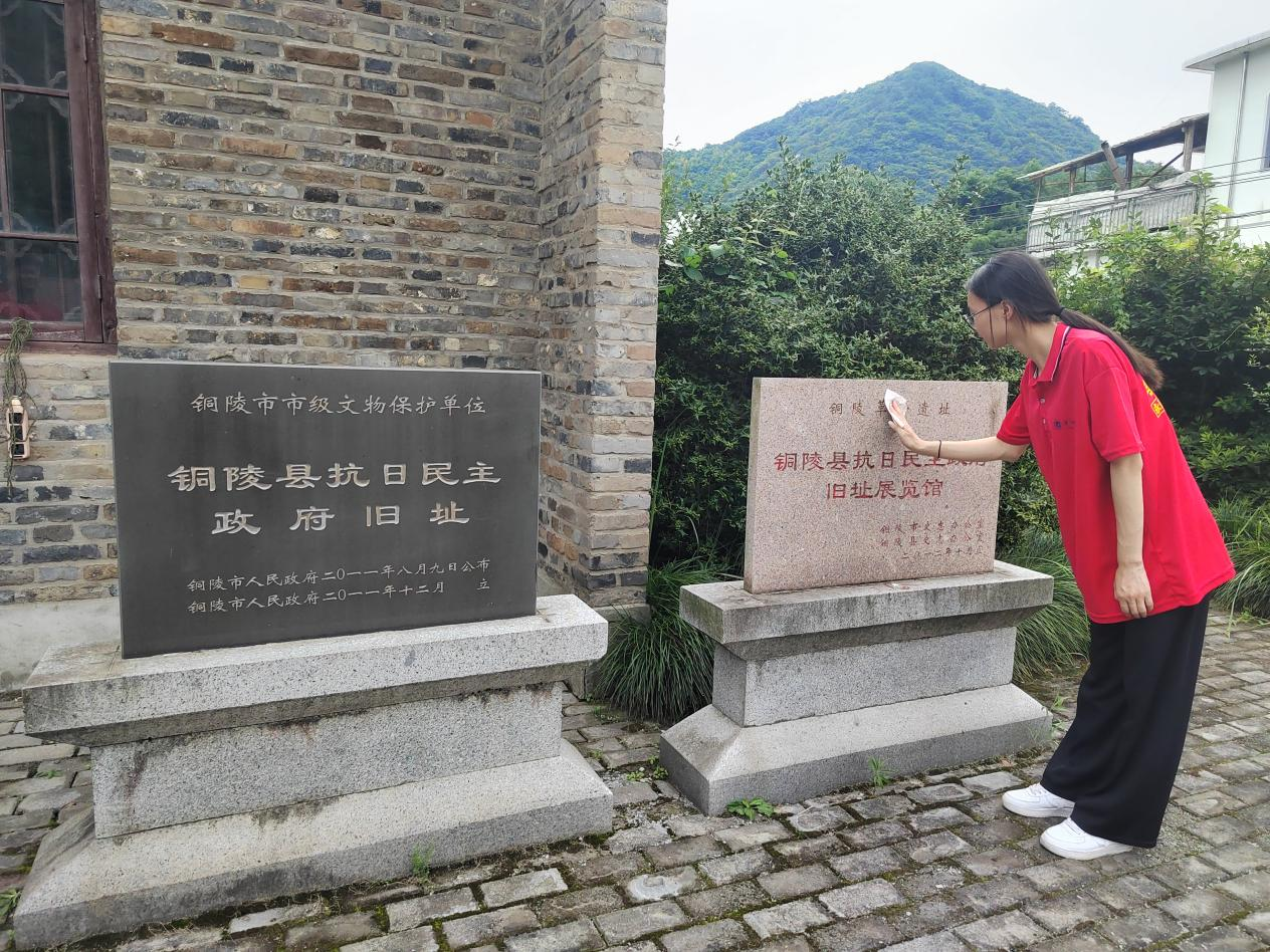 晨光熹微,微風南送。第一小隊首先來到銅陵縣抗日民主政府舊址——今銅陵市義安區鐘鳴鎮泉欄村舒家店。1945年1月,在銅青南行政辦事處的基礎上,中國共產黨成立了皖南第一個縣級抗日民主政權——銅陵縣抗日民主政府。舊址矗立山顛,俯瞰長江,保持了原有的徽派建筑風格。內設“日軍暴行”“抗日烽火”“抗日民主政府”“軍民奮戰”和“弘揚革命傳統、建設和諧銅陵”等主題展廳,并原貌復原了抗戰時期銅陵地形地貌沙盤,收錄許多珍貴的先烈資料、手寫信件、照片、地形圖、軍裝等。一件件實物、一張張照片、一個個故事,讓實踐團全體成員透過歲月的層層帷帳,深入了解新四軍第七師英勇抗戰的光輝歷程和斗爭精神,重溫了那段波瀾壯闊的崢嶸歲月,在解說員的娓娓道來中,團隊成員仿佛身臨其境,置身于那段戰火紛飛的崢嶸歲月之中。