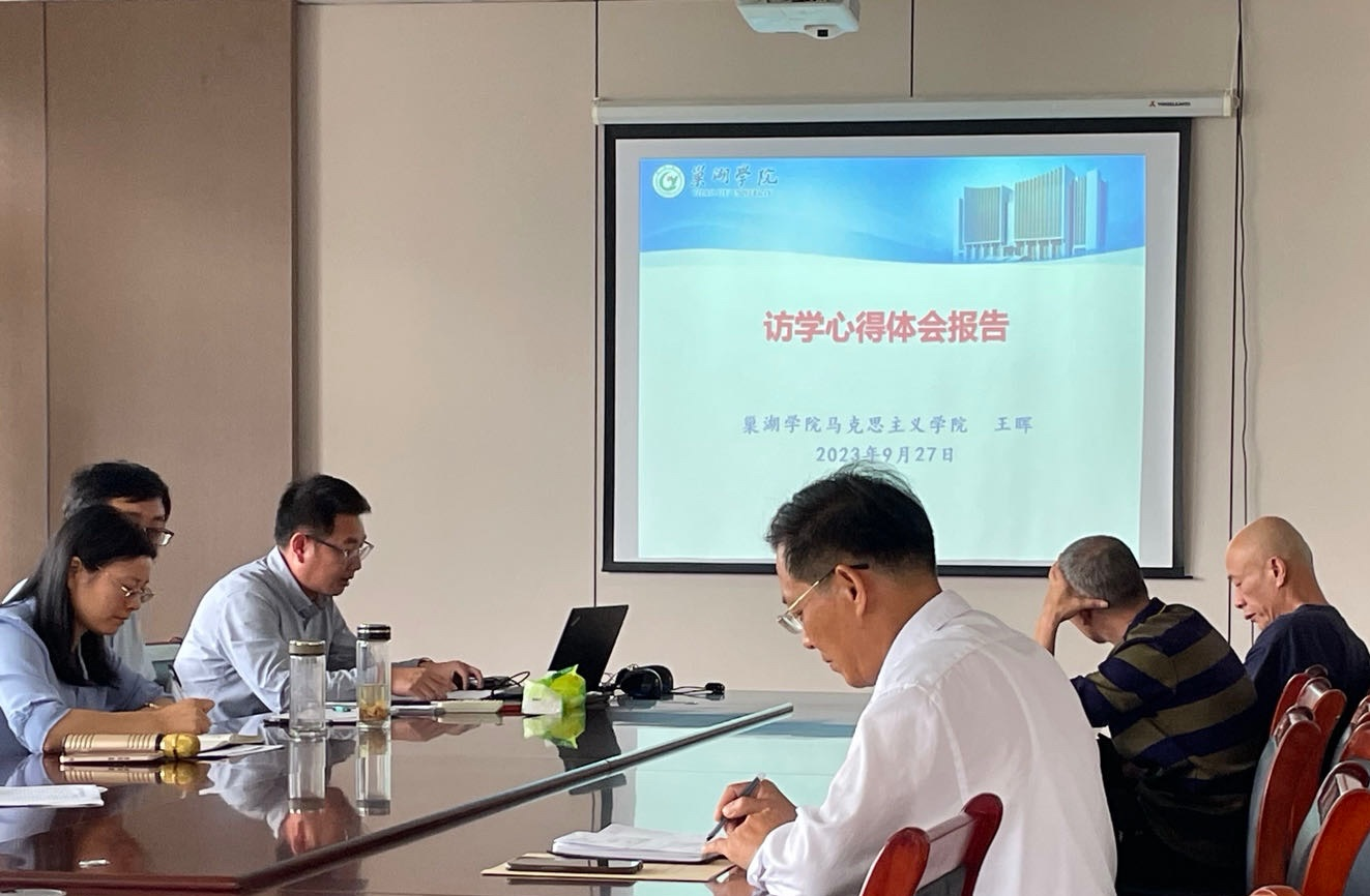 2023年9月27日下午,王暉老師在馬克思主義學院會議室作訪學心得體會報告,會議由馬克思主義學院副院長楊芳主持,馬克思主義學院全體教職工參加會議。