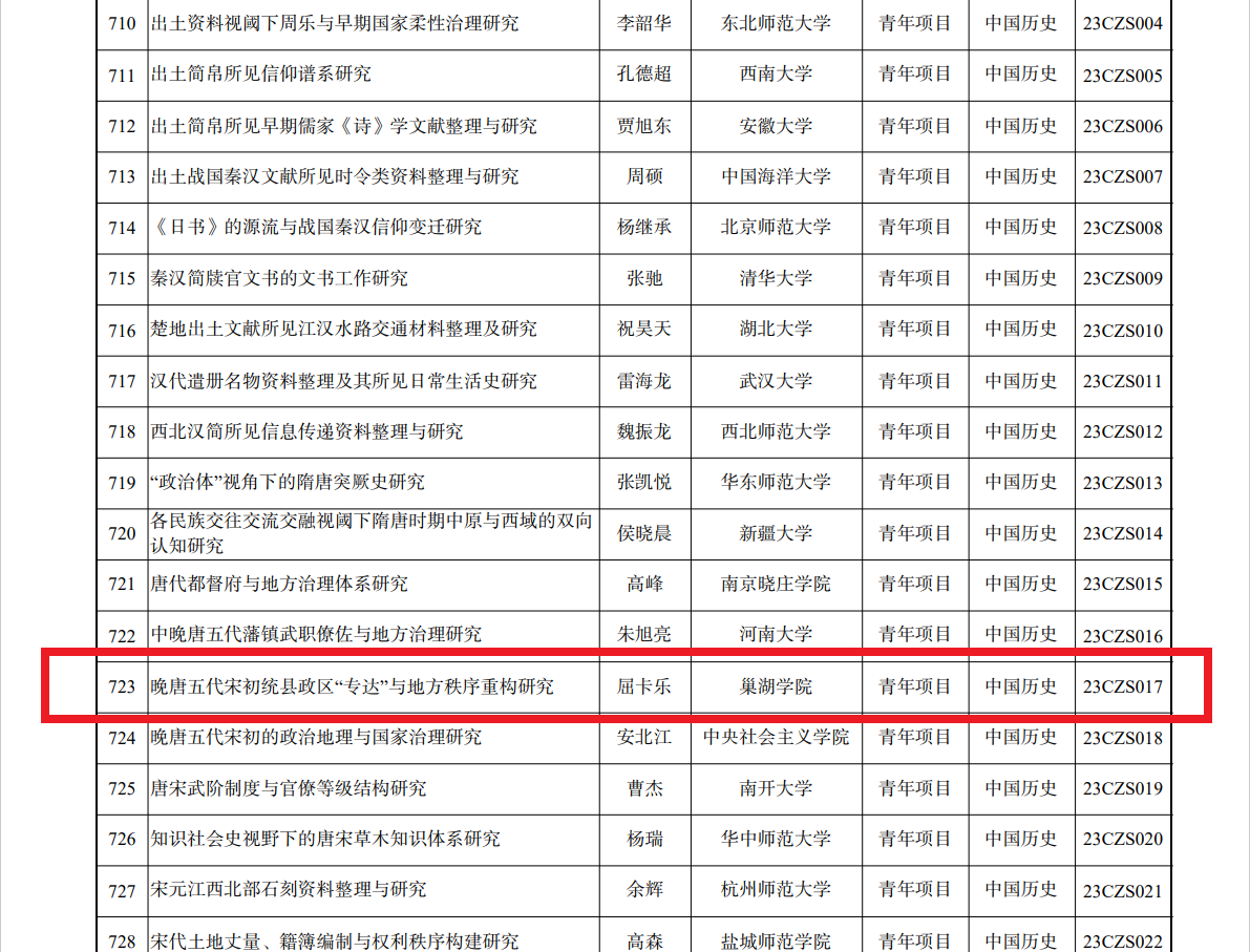 9月4日,全國哲學社會科學工作辦公室公布2023年國家社科基金項目立項名單,我院屈卡樂博士主持的課題“晚唐五代宋初統縣政區‘專達’與地方秩序重構研究”喜獲國家社科基金青年項目立項。
