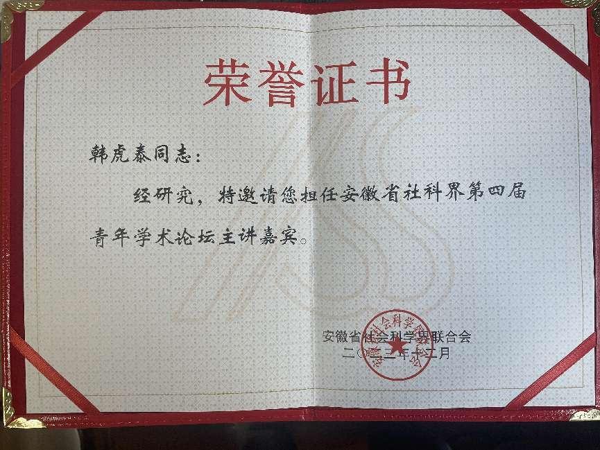 作為安徽省社科界青年學者協(xié)會創(chuàng)始會員,巢湖學院馬克思主義學院韓虎泰老師以特邀主講嘉賓的身份在安徽省社科界第四屆“青年學術(shù)論壇”作大會主旨報告,其提交的“歷史疆域演變視域下中華民族共同體意識的形塑”被評選為省社科界年度十大推介選題。