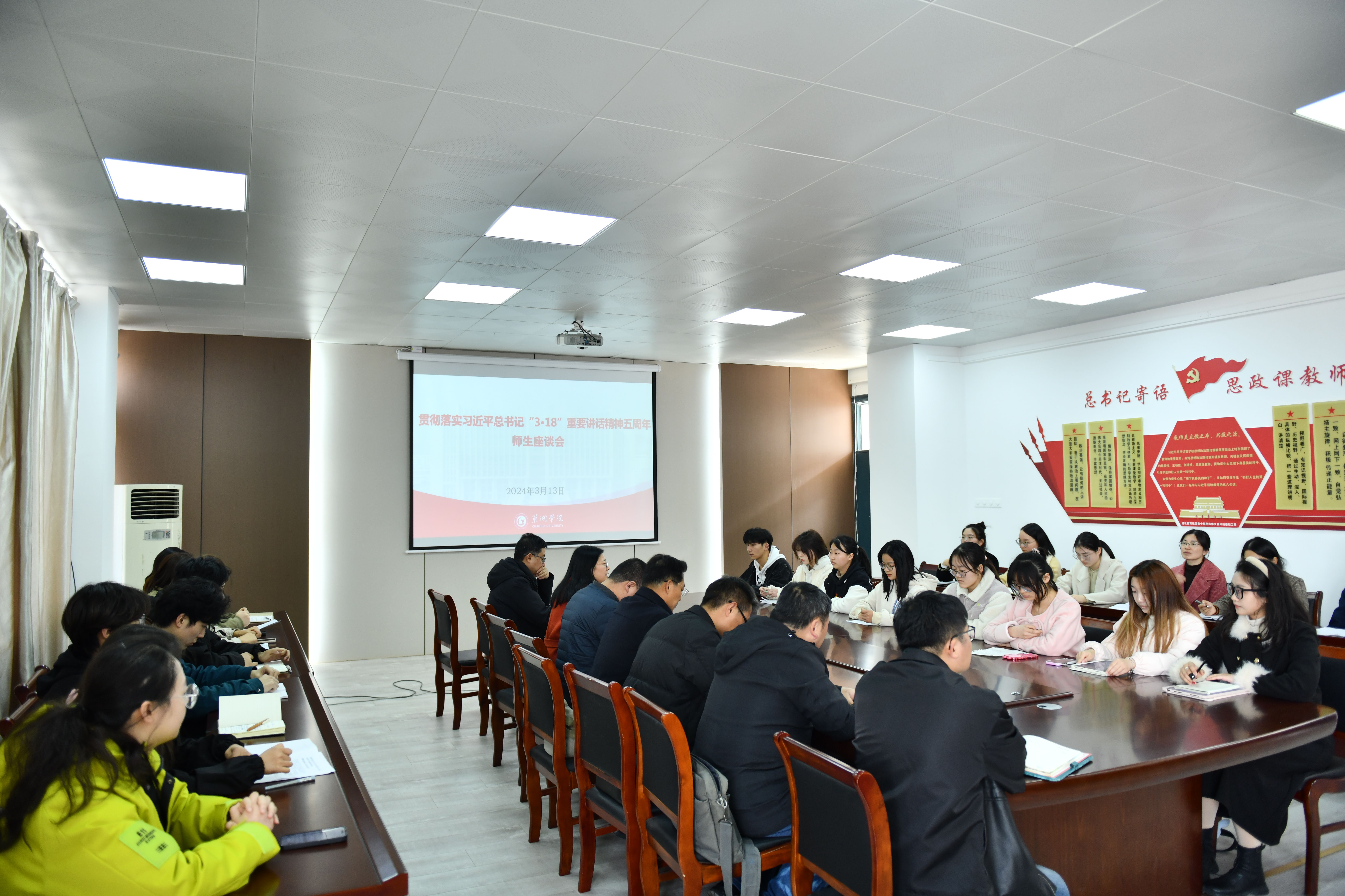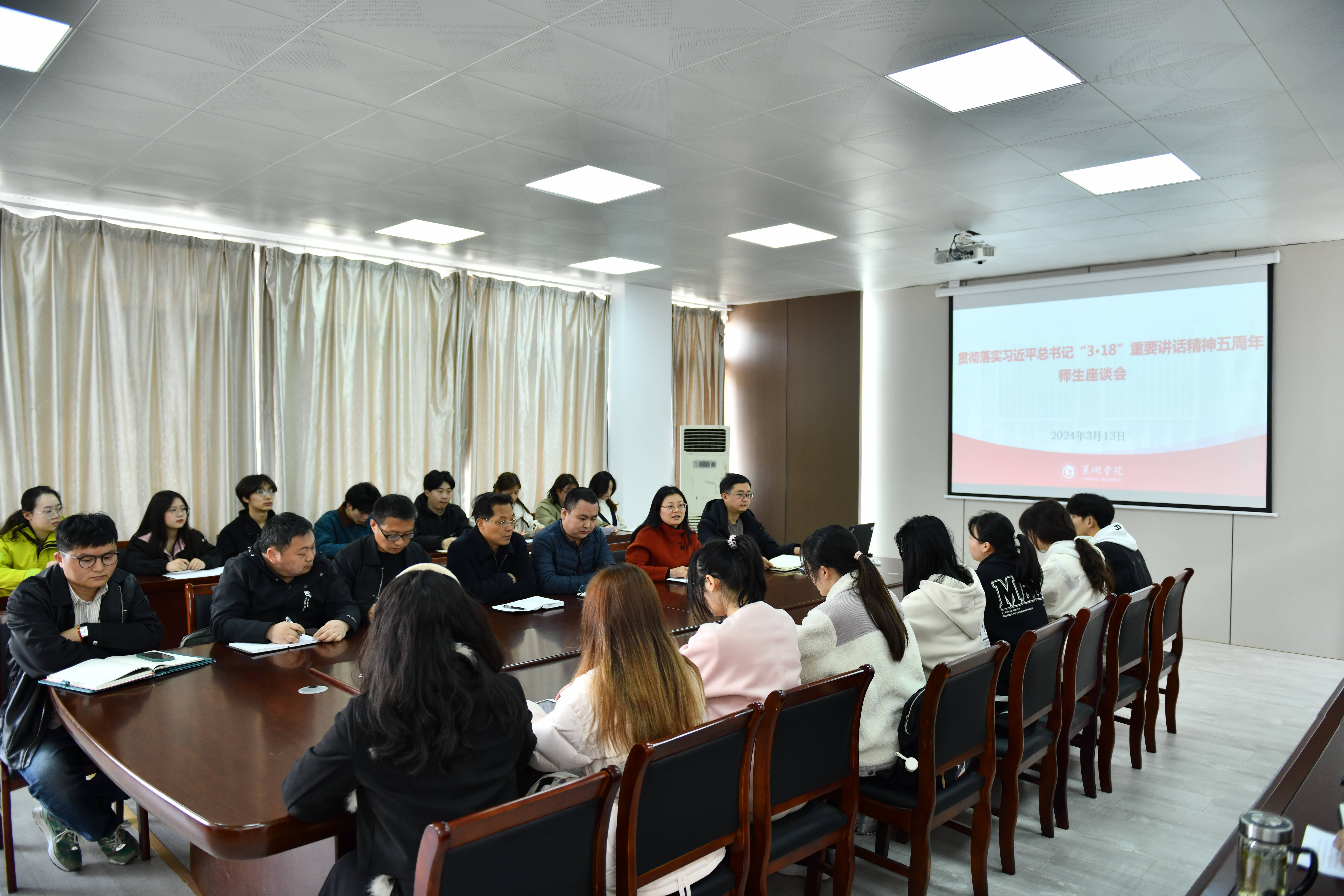為全面做好立德樹人工作,推動學校思想政治工作創新發展,3月13日下午,馬克思主義學院在藝術樓三樓會議室召開重溫習近平總書記“3·18”重要講話精神五周年座談會。馬克思主義學院領導班子、思想政治理論課教師代表及各二級學院學生代表參加座談會。會議由馬克思主義學院副院長楊芳主持。